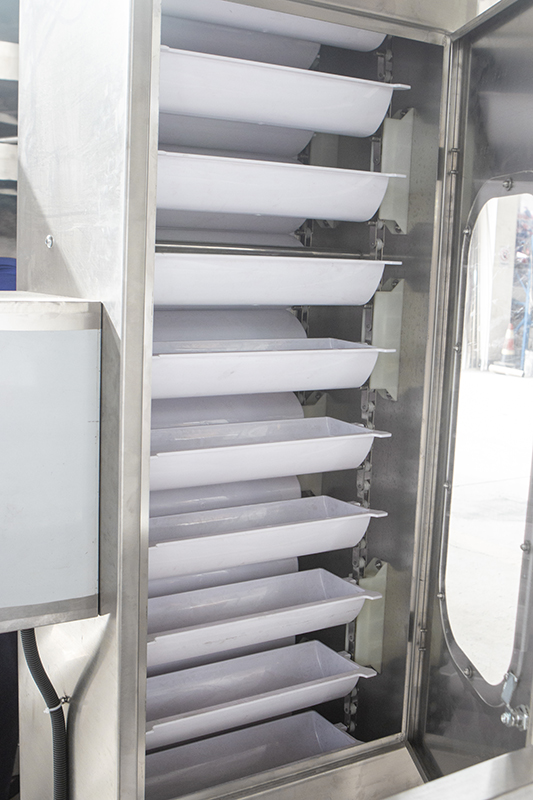 結(jié)構(gòu)、工作原理及使用特點(diǎn):本機(jī)由烘箱、振動(dòng)底座、自動(dòng)上料機(jī)構(gòu)、抽濕裝置、冷卻裝置、連接風(fēng)管、蒸汽換熱器、風(fēng)機(jī)等組成。當(dāng)蒸汽進(jìn)入換熱器后進(jìn)行熱交換,產(chǎn)生高溫干燥熱空氣通過強(qiáng)力風(fēng)機(jī)的作用,由下而上進(jìn)入烘箱,同時(shí)物料在自動(dòng)吸料機(jī)構(gòu)的作業(yè)下自頂部進(jìn)入烘箱,熱空氣與物料在烘箱內(nèi)進(jìn)行逆流交換,物料在振動(dòng)電機(jī)的作用下沿阿基米德螺旋線翻滾走動(dòng),并與熱風(fēng)充分接觸,從而達(dá)到干燥效果。烘箱上部連接吸濕裝置,及時(shí)排除烘焙時(shí)產(chǎn)生的濕氣。烘箱內(nèi)裝有網(wǎng)板,以滿足不同大小的物料烘干要求。全自動(dòng)振動(dòng)烘干設(shè)備最大特點(diǎn)是能源能充分利用、工作連續(xù)性好、物料干燥均勻、生產(chǎn)量大、操作方便、衛(wèi)生條件好、易清洗、易維護(hù)、適用范圍廣。整機(jī)均由全不銹鋼制作,符合GMP要求。本機(jī)適用于烘干帶濕潤(rùn)水的物料,不適合烘干含有結(jié)合水的物料。