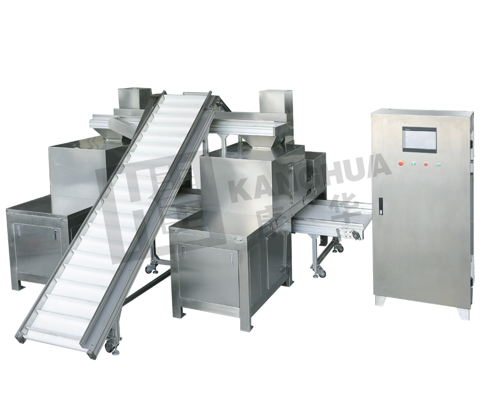 將兩臺單獨(dú)的刨片機(jī)組合,實(shí)現(xiàn)上料,分流,稱重,切制,出料全自動的生產(chǎn)過程。進(jìn)料端設(shè)有輸送式儲料箱,可以儲存較大量原物料,減少人工加料次數(shù)。運(yùn)行全程由PLC微電腦控制操作,具有連續(xù)作業(yè)、能耗低、產(chǎn)量高等優(yōu)點(diǎn)。符合GMP要求。